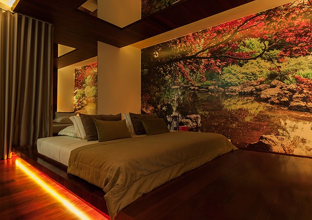Este quarto possui jardim interior, com deck no chão, nas paredes e no tecto.